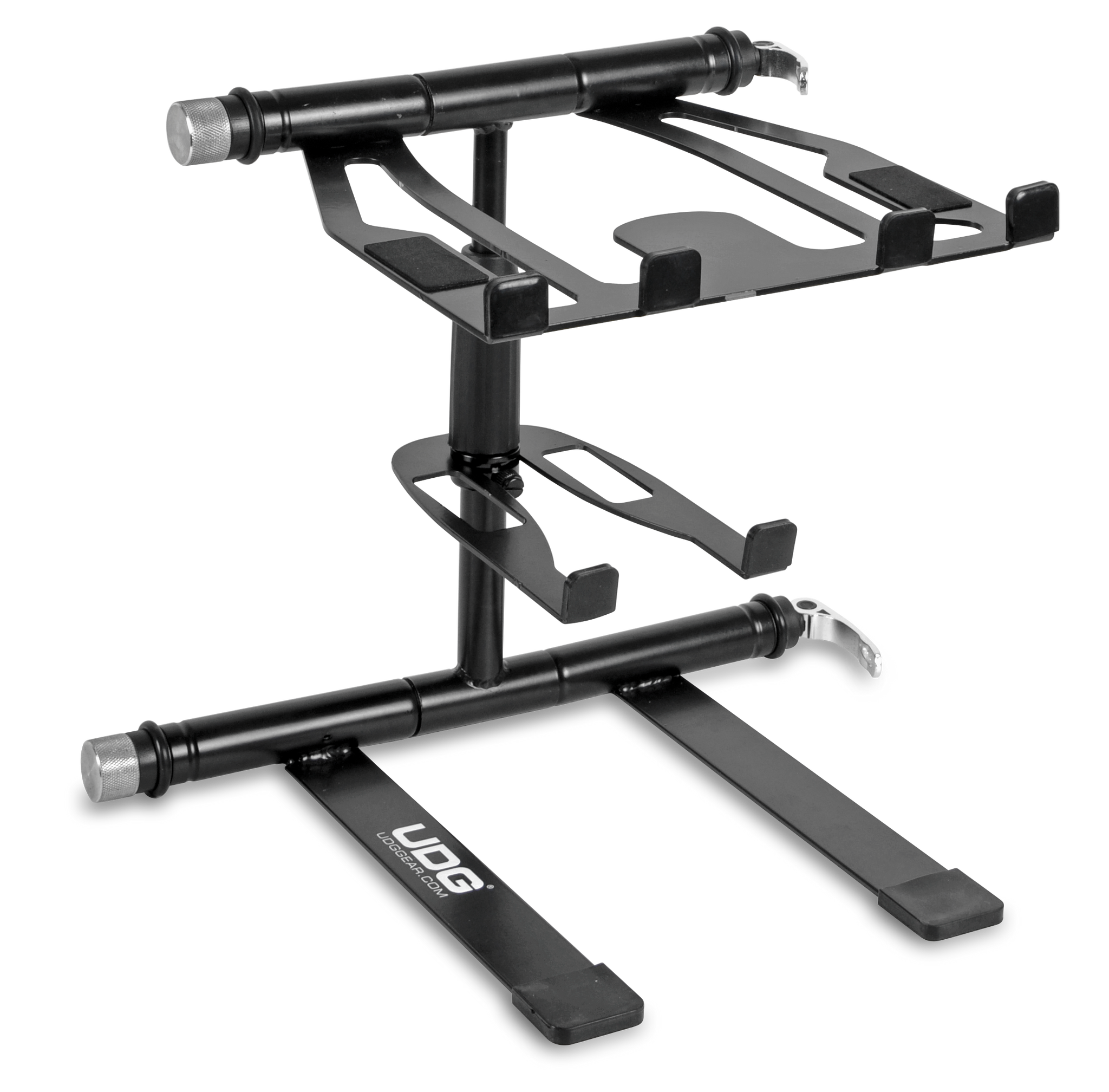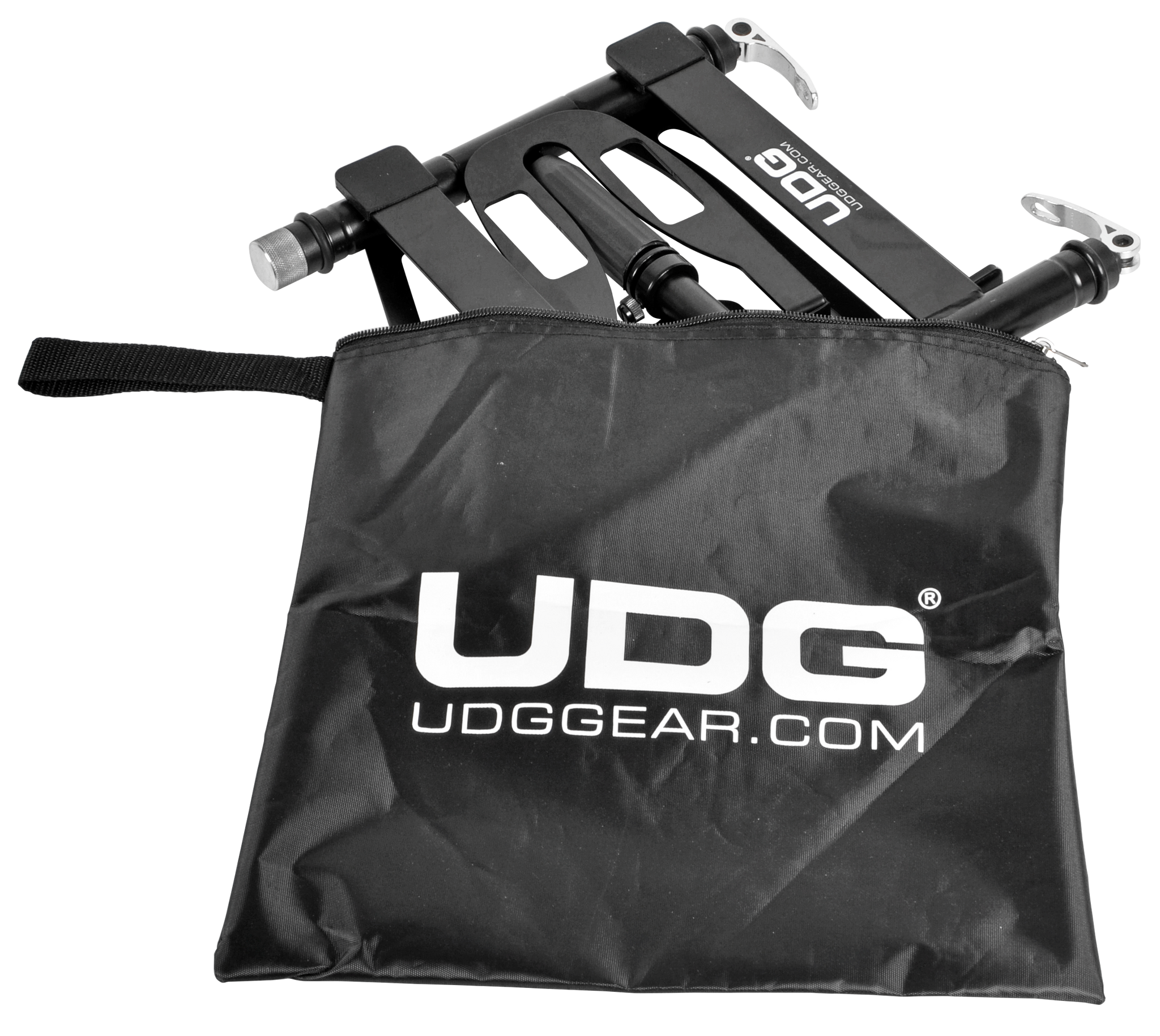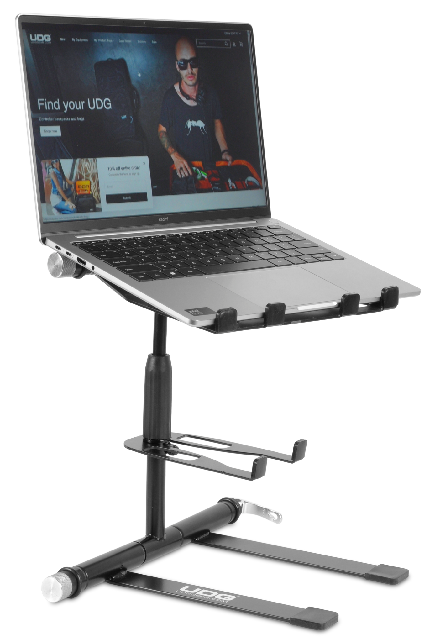 UDG DIGI ラップトップスタンドは、モバイルDJ や音楽プロデューサーのために設計された、 “究極の柔軟性”を誇るラップトップスタンドです。 高さ・角度・トレイの回転(360度)を自在に 調整でき、最大18インチまでのノートPC、タブ レットや小型コントローラーに対応します。 滑り止めマットとラバーエッジを備えたトレイが、 機材をしっかり固定し傷付きを防止。さらに、最 適な通気性を確保するデザインにより、機材のオ ーバーヒートを防止します。 取り外し可能なサブトレイは、USBハブ、外付け HDD、オーディオインターフェースなどのアクセ サリー収納に便利です。 C字型・Z字型の両構成に対応し、簡単に折りたた んで持ち運び可能です。専用の保護スリーブも付属 しており、ライブやスタジオ移動のパートナーとし て理想的な一本です。