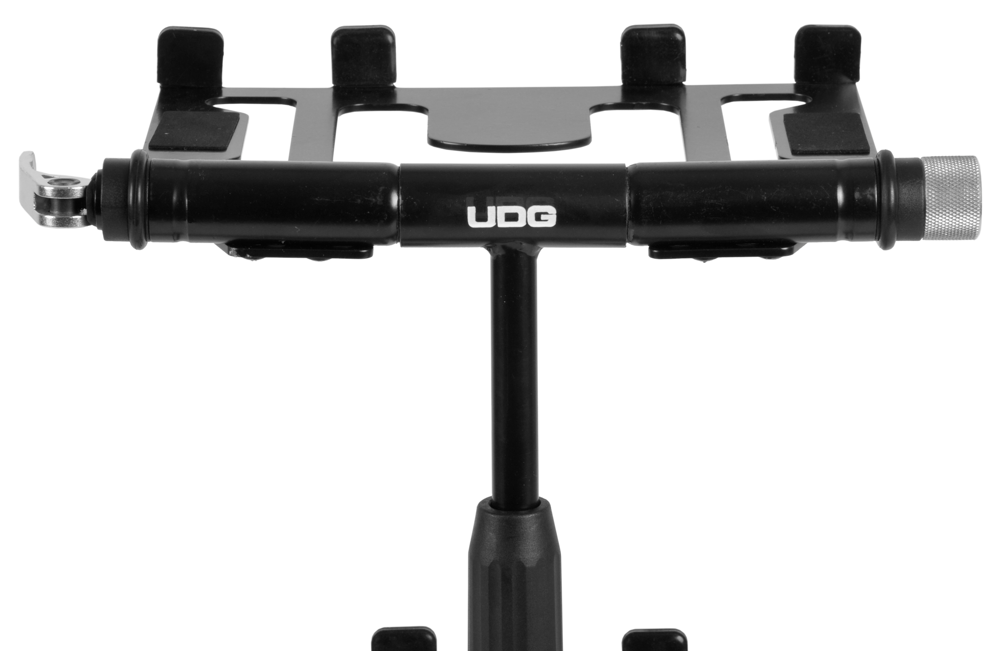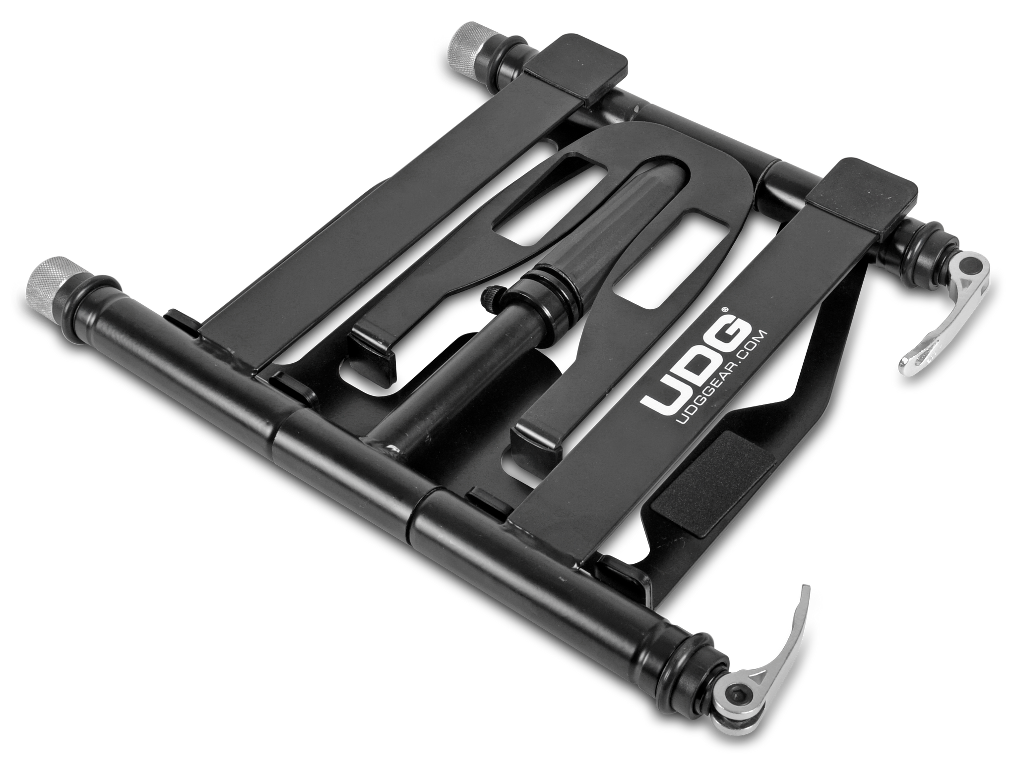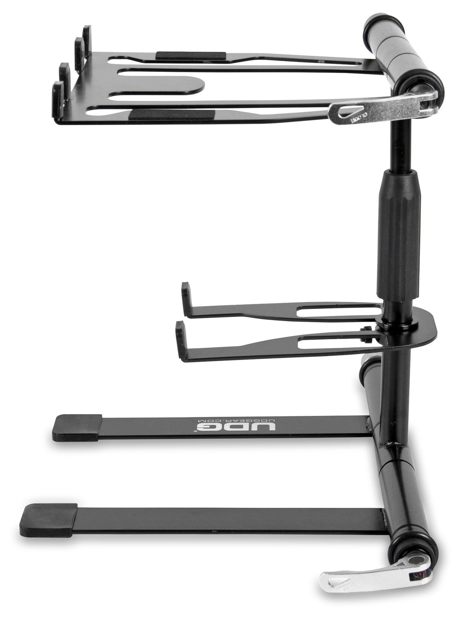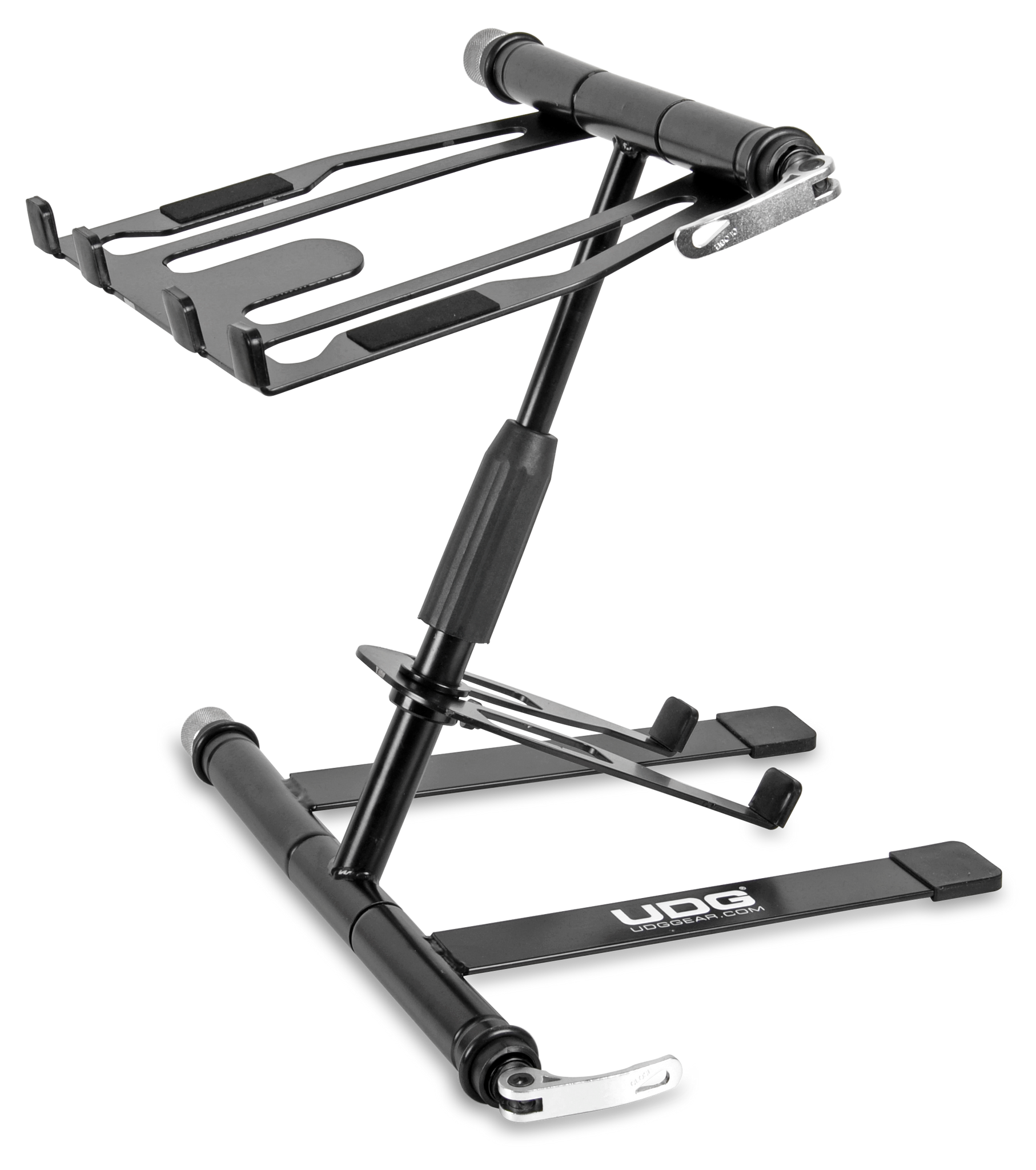 UDG DIGI ラップトップスタンドは、モバイルDJ や音楽プロデューサーのために設計された、 “究極の柔軟性”を誇るラップトップスタンドです。 高さ・角度・トレイの回転(360度)を自在に 調整でき、最大18インチまでのノートPC、タブ レットや小型コントローラーに対応します。 滑り止めマットとラバーエッジを備えたトレイが、 機材をしっかり固定し傷付きを防止。さらに、最 適な通気性を確保するデザインにより、機材のオ ーバーヒートを防止します。 取り外し可能なサブトレイは、USBハブ、外付け HDD、オーディオインターフェースなどのアクセ サリー収納に便利です。 C字型・Z字型の両構成に対応し、簡単に折りたた んで持ち運び可能です。専用の保護スリーブも付属 しており、ライブやスタジオ移動のパートナーとし て理想的な一本です。